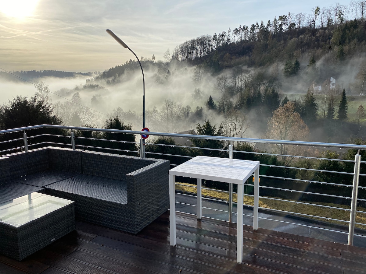 Eksklusiv indkvartering i moderne stil! Ideel til singler eller par - hav din fred og nyd en pause. - Skiløb, vandreture, cykling, vandreture med mere - Neckar og Schwarzwald toppe lige uden for døren - Fitness og wellness: sauna, håndvægte, HulaHoop, 2 mountainbikes - Fuldt udstyret køkken med alle beslagene - Fantastisk sydvest solrig balkon - Loungeområde (afslapning eller fjernarbejde) - Gulvvarme med hyggeligt parketgulv i egetræ - Nespresso-maskine - eCharging Wallbox