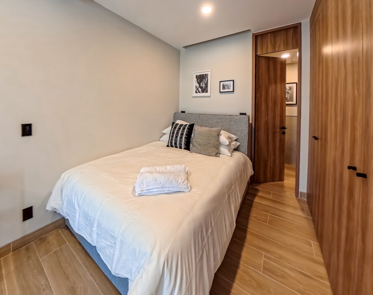 Denne smukke lejlighed i Chapalita med minimalistisk og funktionelt design er designet til at tilbyde dig et behageligt, sikkert og stilfuldt ophold, uanset om du kommer for at arbejde, turisme eller hvile. Kun 2 minutters gang til Expo Guadalajara. Den har 2 soveværelser, udstyret køkken, stue, spisestue, komplet badeværelse, smart-tv, højhastigheds-WiFi, vaskemaskine og privat parkering. Lejligheden tilbyder fitnessrum, taghave med spektakulær udsigt, fælles arbejdsområder, sociale områder og sikkerhed døgnet rundt.