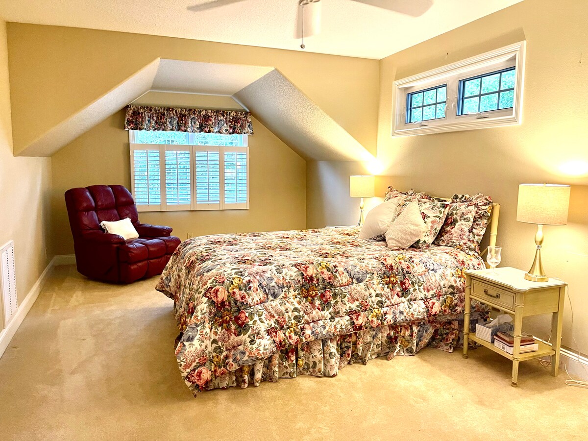 Dette 560 kvadratmeter store rustikke, smarte gæstehus er et åbent koncept, der rummer 1-2 voksne personer komfortabelt. Sovepladserne er queen-size, to enkeltsenge og en sofa. Fuldt udstyret køkken med fyldt spisekammerklammer. Der er ingen vaskemaskine/tørretumbler, men der er plads til en udendørs tørresnor. Nyd vores ildsteder og Arbor. Egen indgang og asfaltparkering.