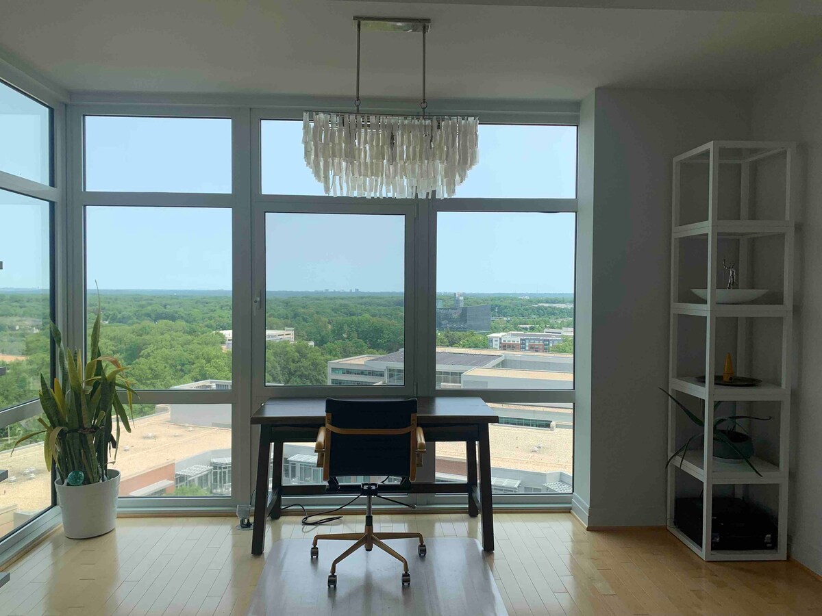 Beliggende i hjertet af Tysons tæt på shopping, restauranter og 20 minutter fra DC. 1 soveværelse/1 badeværelse med en utrolig udsigt fra højderne. Arbejd i solrummet med en vid udsigt over Washington D.C. Alt, hvad du har brug for til en afslappende ferie eller en produktiv arbejdsrejse. Inkluderer din egen dedikerede parkeringsplads under jorden. Nyd bygningen med flere faciliteter ved at bruge fitnessrummet eller tagterrassen med pool.