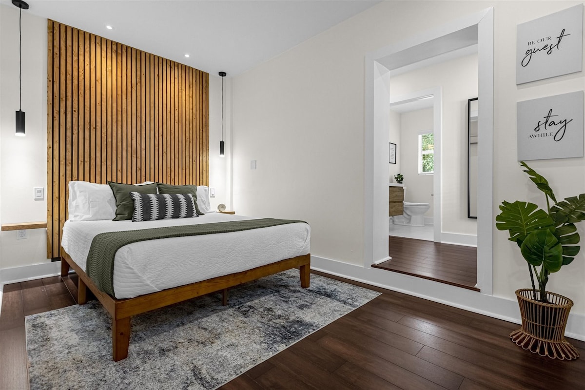 Privat og komfortabel suite med 1 soveværelse/bad i et byhus fra 2021 med vinduer med udsigt, queensize-dobbeltseng, brusekabine og privat indgang. Udstyret med lofts- og bærbare ventilatorer, Roku smart-tv, minikøleskab/fryser, mikrobølgeovn og Keurig. Beliggende i et sikkert, roligt og gangbart kvarter. 5 minutter fra College Park-butikker, 10 minutter fra downtown Orlando, 25 minutter fra Universal Studios, 30 minutter fra Orlando International Airport og 40 minutter fra Disney.
