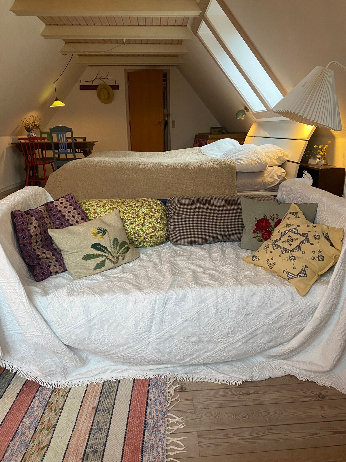 Welcome to the top floor of our charming yellow wood house! Welcome to Anettes Bed & Breakfast. :-) The green room has a king size double bed that can be pulled apart to 2 single rooms. The room is decorated with whimsical details and flowery wallpaper and nice comfy beds. The room faces the red wood house on the west side of the house, where you can enjoy the evening sun. My B&B has 2 rooms, so you may meet travellers from the other room.