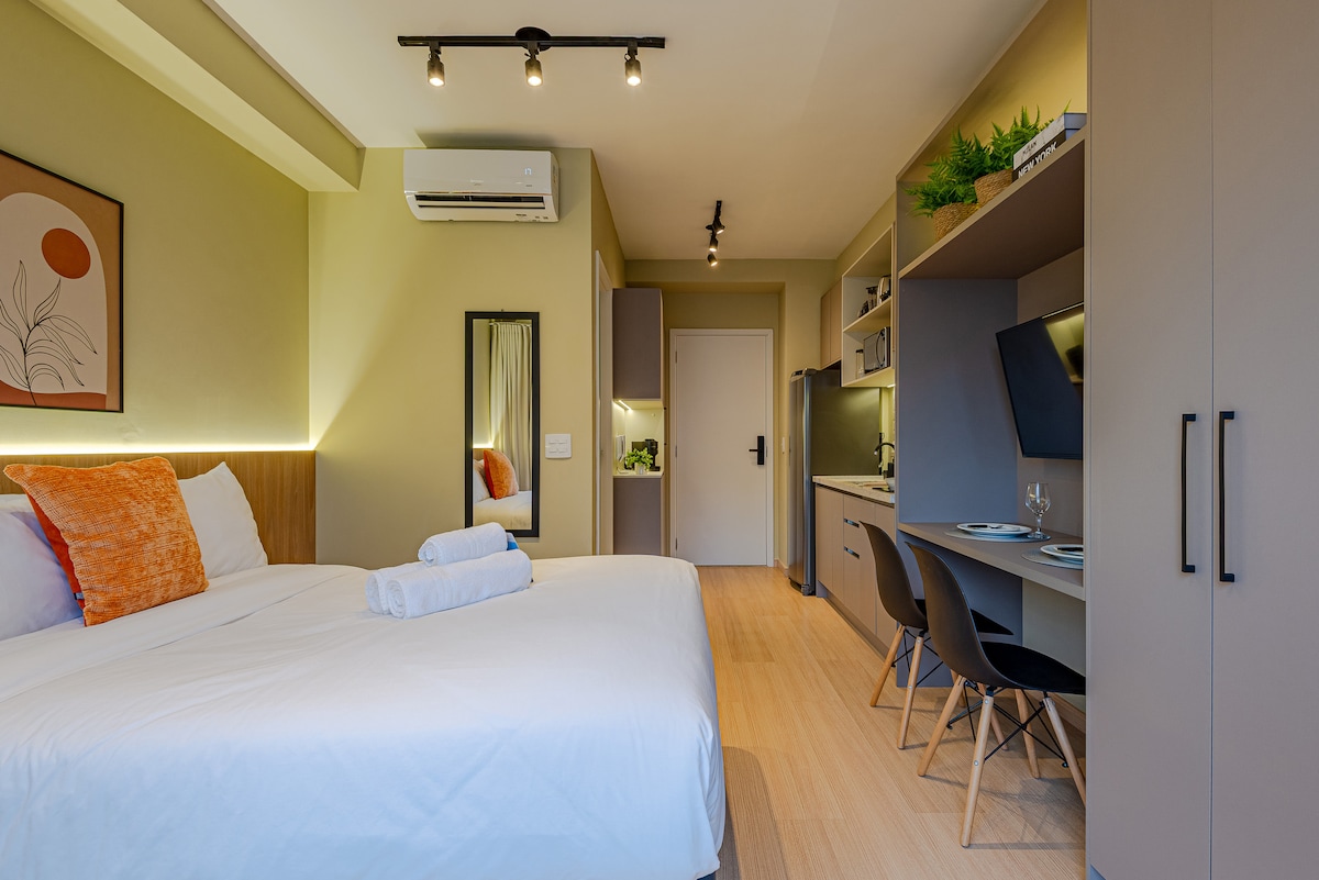 Boutique-studie med en af de smukkeste udsigter over São Paulo. Beliggende 2 minutters gang fra metroen. Fuldt udstyret køkken med køleskab skjult af trædør. Wi-fi, aircondition og smart-tv 55 tommer. Indtjekning uden vært med smart elektronisk lås. Spil tennis, eller gå i fitnesscenteret, og slap af i poolene (udendørs eller opvarmet indendørs) og saunaerne (våd eller tør) bagefter. Fællesområdet omfatter også fælles arbejdsområder og vaskeri. Besøgende skal være registreret i forvejen i receptionen.