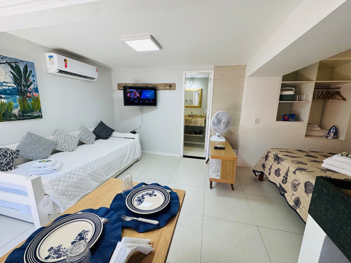 Lejlighed, der kan rumme op til 4 gæster (se billeder for at analysere komforten og placeringen af de enkelte madrasser) med balkon, aircondition, tv, køleskab, arbejds- og spisebord, køkken udstyret til små måltider, garderobe, komfortabelt badeværelse og en parkeringsplads. Den ligger tæt på butikker, gastronomisk centrum og 700 meter fra Praia do Forte Der er bagageopbevaring på hotellet, hvor du kan efterlade din bagage gratis