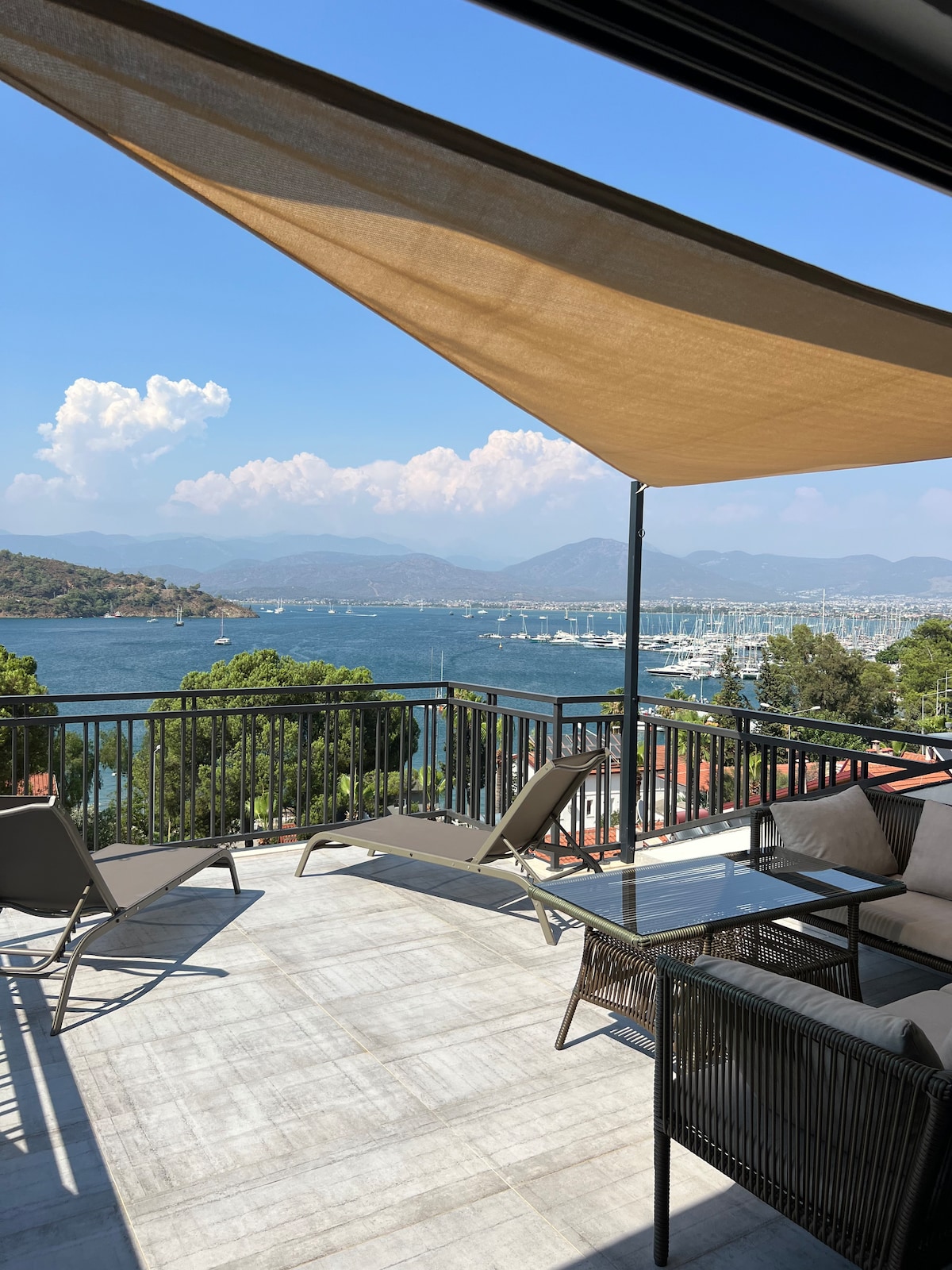 Stille lejlighed på øverste etage med en bred terrasse med udsigt over bugten - den slags udsigt, der får dig til at lægge din telefon fra dig. Boligen er enkel, ren og fyldt med det, du har brug for til et kort ophold. Området er fredeligt, men det er kun 10 minutters gang til byen eller en hurtig køretur til strandene. Der er også en naturskøn skovvandring op til den forladte landsby Kayaköy. Vi bor i nærheden og forsøger at holde alt problemfrit, betænksomt og lavt profileret, så du kan nyde dit ophold.