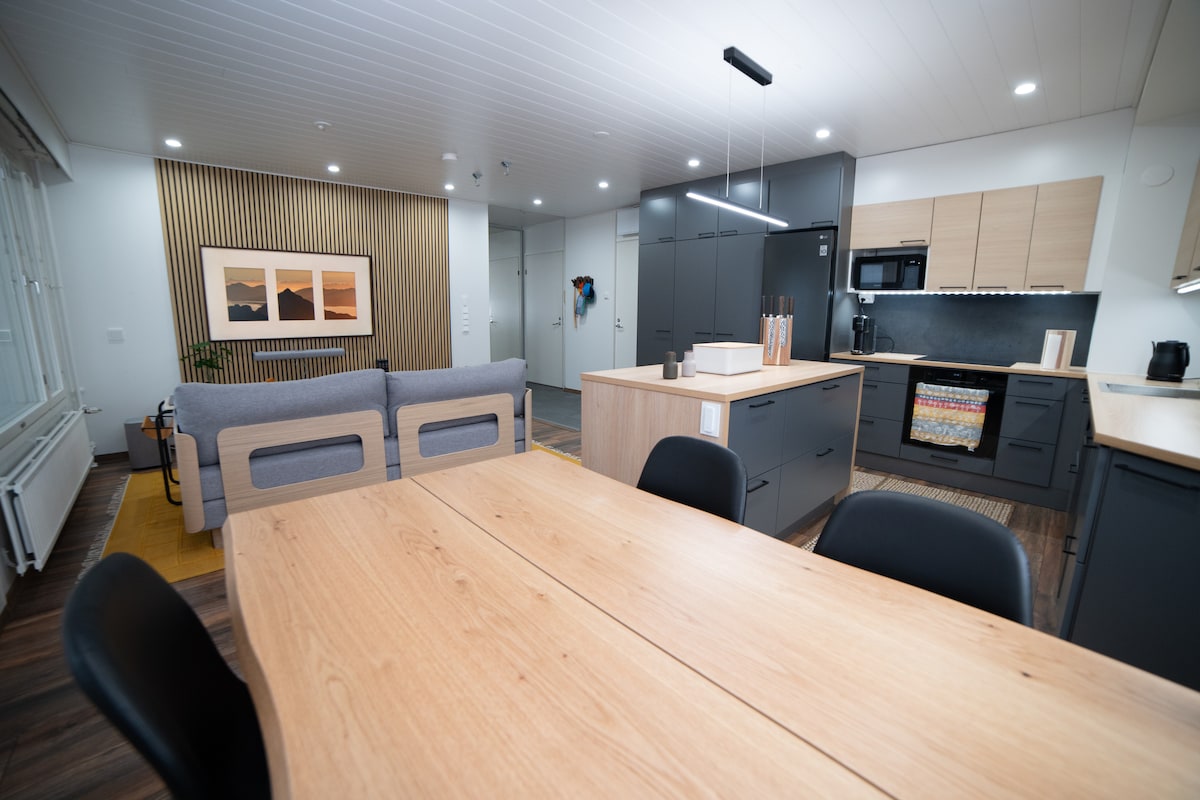 Velkommen til CityLuppo - Elevator 2. sal. 59 m2 fire senge - Ideel til par og familier op til fire personer - Højhastigheds-wi-fi (> 700 mb) - 65"Smart-tv med hjemmebiografhøjttalere - 100" biograf i soveværelset - Kingsize-dobbeltseng (160 cm) + 2 sovesofaer. - Gratis parkering på stedet ⇛ 2 minutter til restauranter ⇛ 12 minutter til busstoppested til Santa Claus Village ⇛ 10 minutters kørsel fra lufthavnen ⇛ 2 km gang til bus- eller togstation Sengetøj og håndklæder er inkluderet