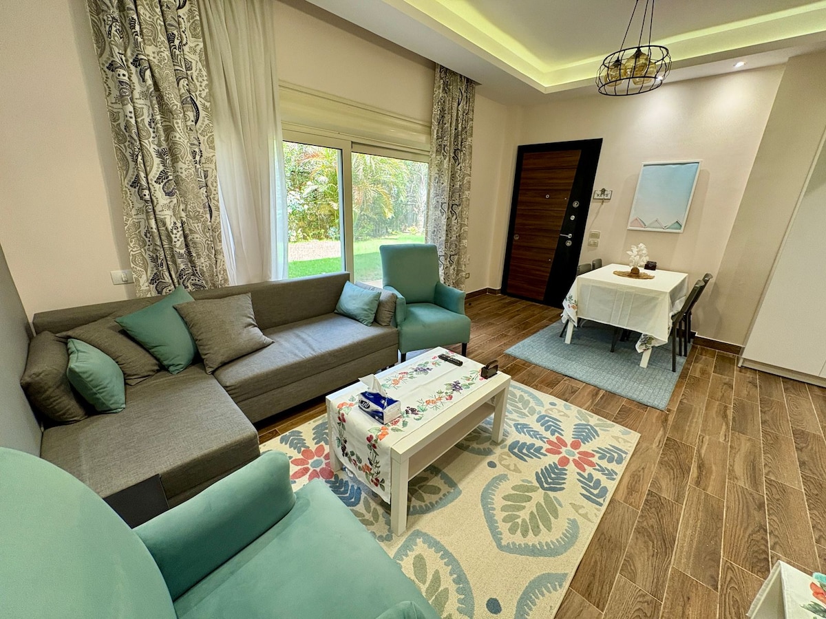 Denne unikke bolig har sin helt egen stil. Et rummeligt 1-værelsesværelse med en udtræksseng til gæster og et komplet køkken, i stueetagen med en luksuriøs baggård og privat indgang i et sikret område. I nærheden af store indkøbscentre og erhvervsparker i Central Zayed. Grunden har også basisting som sikkerhed døgnet rundt, låst adgang og mange nærliggende nærbutikker, der leverer. Kun 25 minutter til pyramiderne, 15 til Smart Village og 20 til Grand Egyptian Museum.