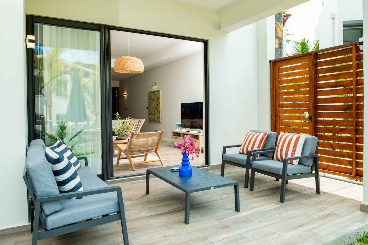 Appartement luxueux et confortable pour 6 personnes. Avec ses 3 chambres à coucher, son vaste séjour, la grande terrasse avec petite piscine privative et les 2 espaces repas (intérieurs et extérieurs), c'est un véritable havre de paix. Idéalement placé en plein cœur de l’Anahita Golf & Spa Resort, profitez de toutes les commodités de ce magnifique resort (tennis, piscine du Resort...) et des nombreux avantages associés au logement (tarifs réduits pour le green fee, restaurants du Resort...).