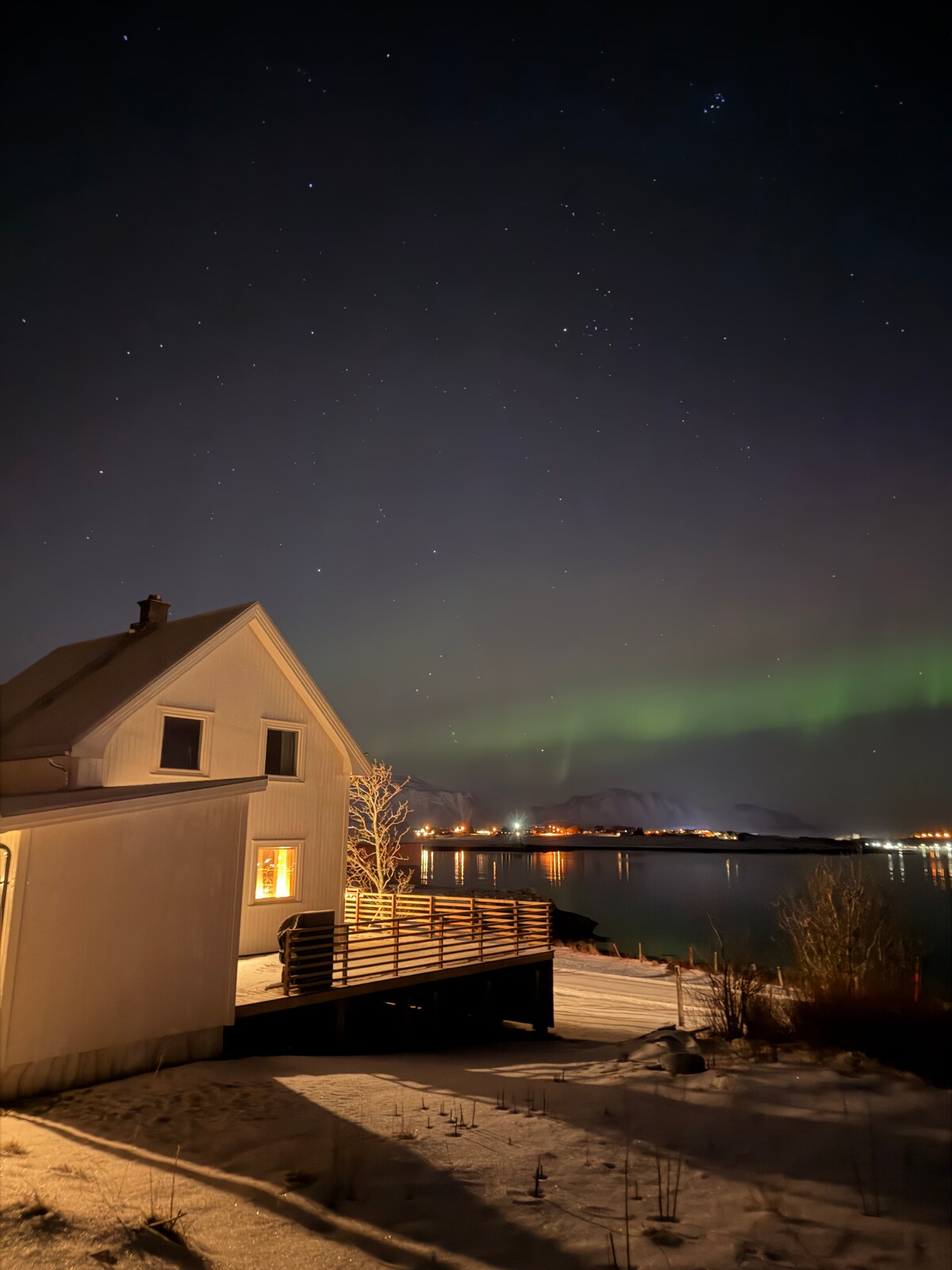 Velkommen til vårt sjarmerende hus ved sjøen, perfekt plassert under de majestetiske fjellene i Lofoten. Denne koselige boligen tilbyr spektakulær utsikt over både fjorder og fjell, og ligger bare et steinkast fra vannet. Her kan du nyte det beste av begge verdener. Slapp av på terrassen mens du ser nordlyset danse over havet, eller ta en kort spasertur for å utforske de naturskjønne omgivelsene. Denne idylliske beliggenheten gir deg en unik mulighet til å oppleve Lofotens skjønnhet og ro.