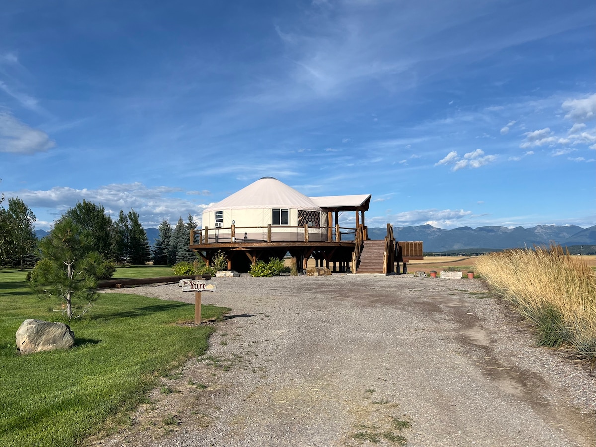 Denne 2-værelsesjurt ligger på vores gård på en privat vej i den nordlige ende af Flathead Lake. Udsigten er spektakulær, da den er på en 8 fods platform, så du kan nyde 360 graders udsigt over dalen, Flathead Lake, Glacier Park, Swan Mountains, Blacktail Mountain og den store himmel og stjerner i Montana. Nyd 855 kvadratmeter, som omfatter 2 soveværelser, badeværelse, vaskemaskine og tørretumbler, fuldt køkken med Miele-apparater og et dejligt stort opholdsområde, herunder et spiseområde. Omgivende dæk.