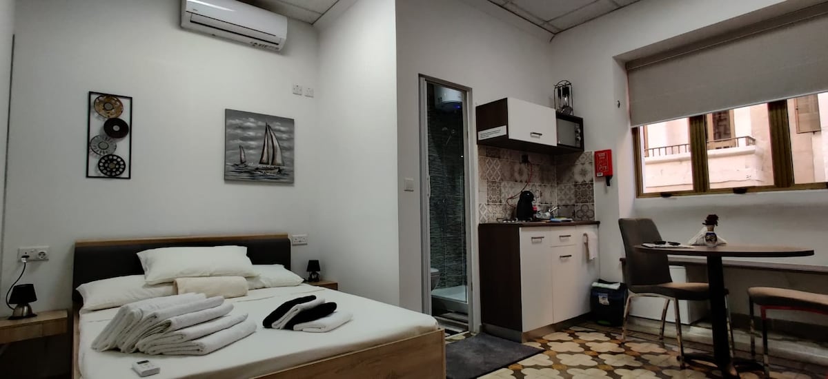Denne atelierlejlighed er nyrenoveret med en blanding af moderne og antikke koncepter. Den ligger i hjertet af Floriana med en klar udsigt over den historiske Valletta Harbour. Denne gamle og rolige landsby ligger 5 minutters gang fra Valletta, som var Europas hovedstad i 2018. Busstationen ligger 2 gader væk med en busforbindelse til hvor som helst i Malta. Studielejligheden har plads til 3 voksne eller 2 voksne og 2 børn, den har 1 dobbeltseng og en sovesofa med 1 badeværelse.
