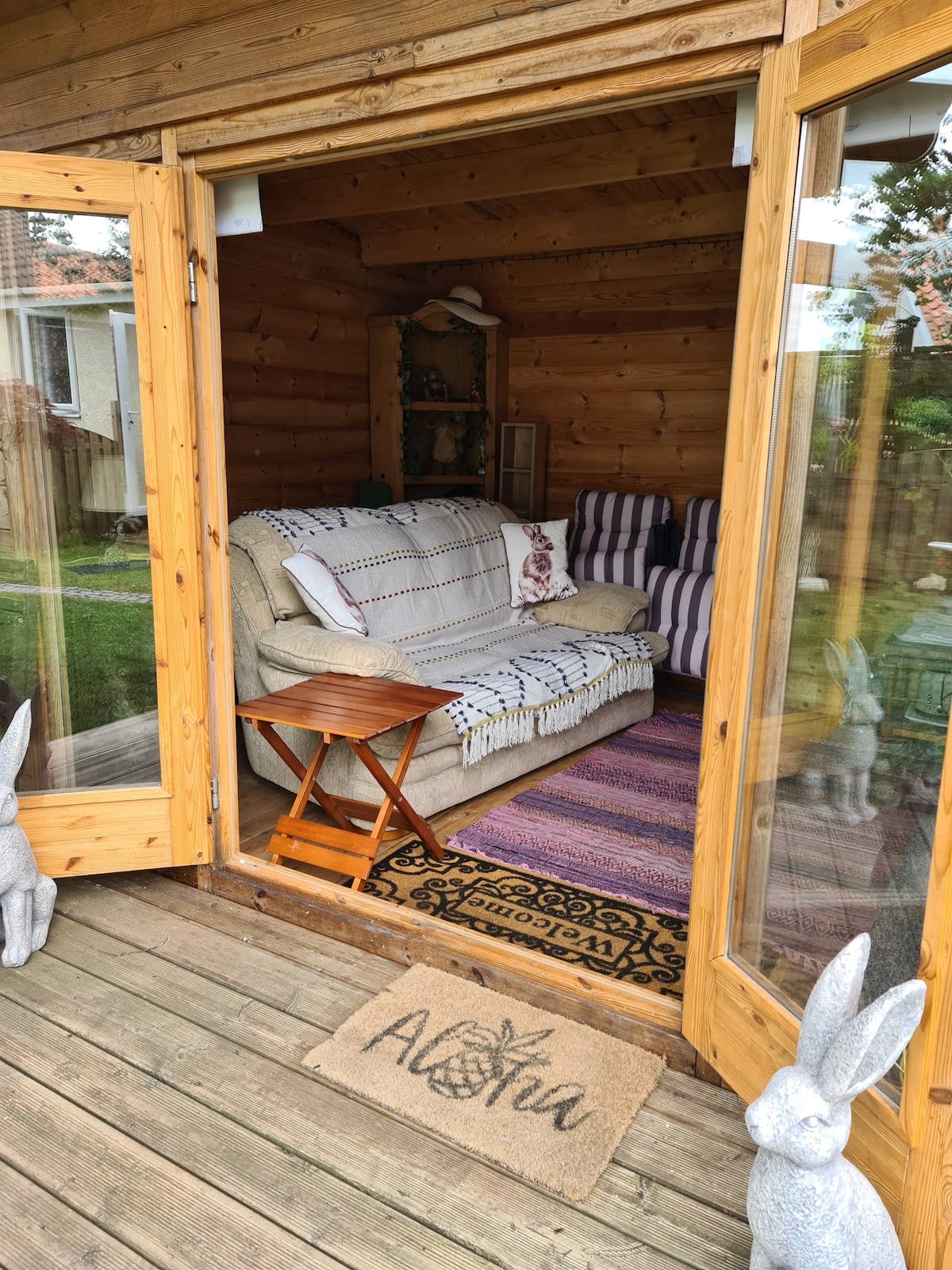 Slap af i denne rummelige hytte med et soveværelse med brændeovn (der opkræves et tillægsgebyr)i privat indhegnet rum direkte ved siden af Cabin. Indenfor hytten er der stue-tv, wi-fi og tekøkken med dobbelt sovesofa til ekstra gæster. Der er 1 separat soveværelse med dobbeltseng(sengetøj og håndklæder leveres mod ekstra betaling) madras,lagen og 2 stikkontakter. Tekøkkenet har mikrobølgeovn, køleskab med fryser, kedel, krus,vinglas, tallerkener, skåle, kul og lille morgenmadsbar med 2 pumpeskamler.