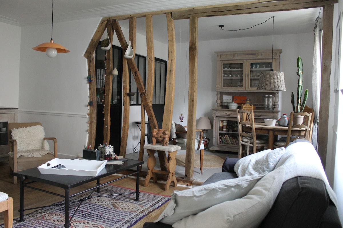 Vores smukke indrettede studie på 18 m2, der ligger under vores terrasse, er klar til at byde dig velkommen, uanset om det er til dine forretningsrejser eller en afslappende pause i ro. Mellem Paris og Normandiet ligger lejligheden ved siden af vores familiehus, der ligger i en stille gade tæt på butikker.