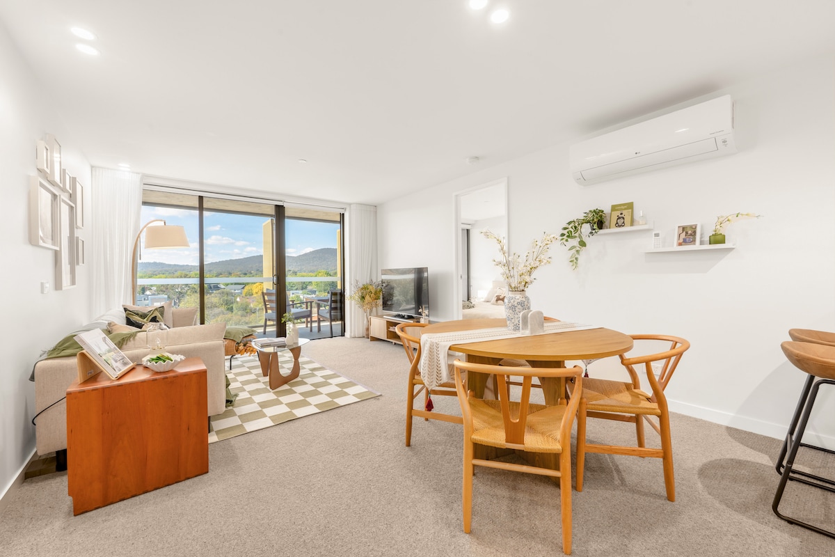 Nyd en fantastisk udsigt over byen og bjergene fra vores moderne hjørnelejlighed i hjertet af Gungahlin. Perfekt til familier, par eller forretningsrejsende. Den har et fuldt udstyret køkken, rummelige opholdsområder, vaskeri, privat balkon og alle fornødenheder til et behageligt længere ophold. Du får også mulighed for gratis, sikker parkering. Træd ud til caféer, shopping, letbane, busstoppesteder og Yerrabi Pond Park – eller slap af med bygningens infinity-pool, fitnesscenter og afslappende udendørs spa.