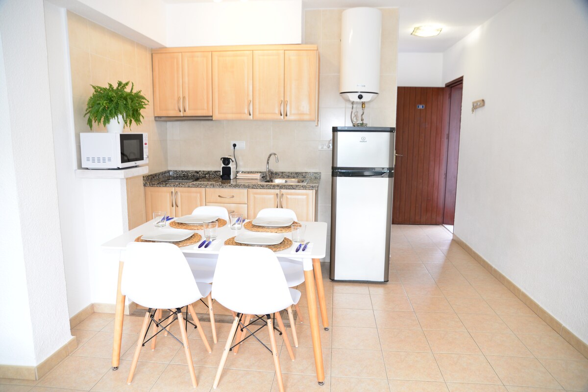Hyggeligt studie 15 minutters gang fra Mitjorn-stranden, 7 km, tæt på Rte Real playa, Kiosko Lucky og Blue Bar! Boligen er komfortabel og enkel, fuldt udstyret og har en lille terrasse, hvor du kan slappe af og læse en bog Lejligheden ligger i et privat område, har en smuk have og ligger i et roligt område, perfekt til en afslappende ferie Ideel til dem, der søger en atmosfære af fred og ro Beliggenheden er perfekt til at besøge øen!