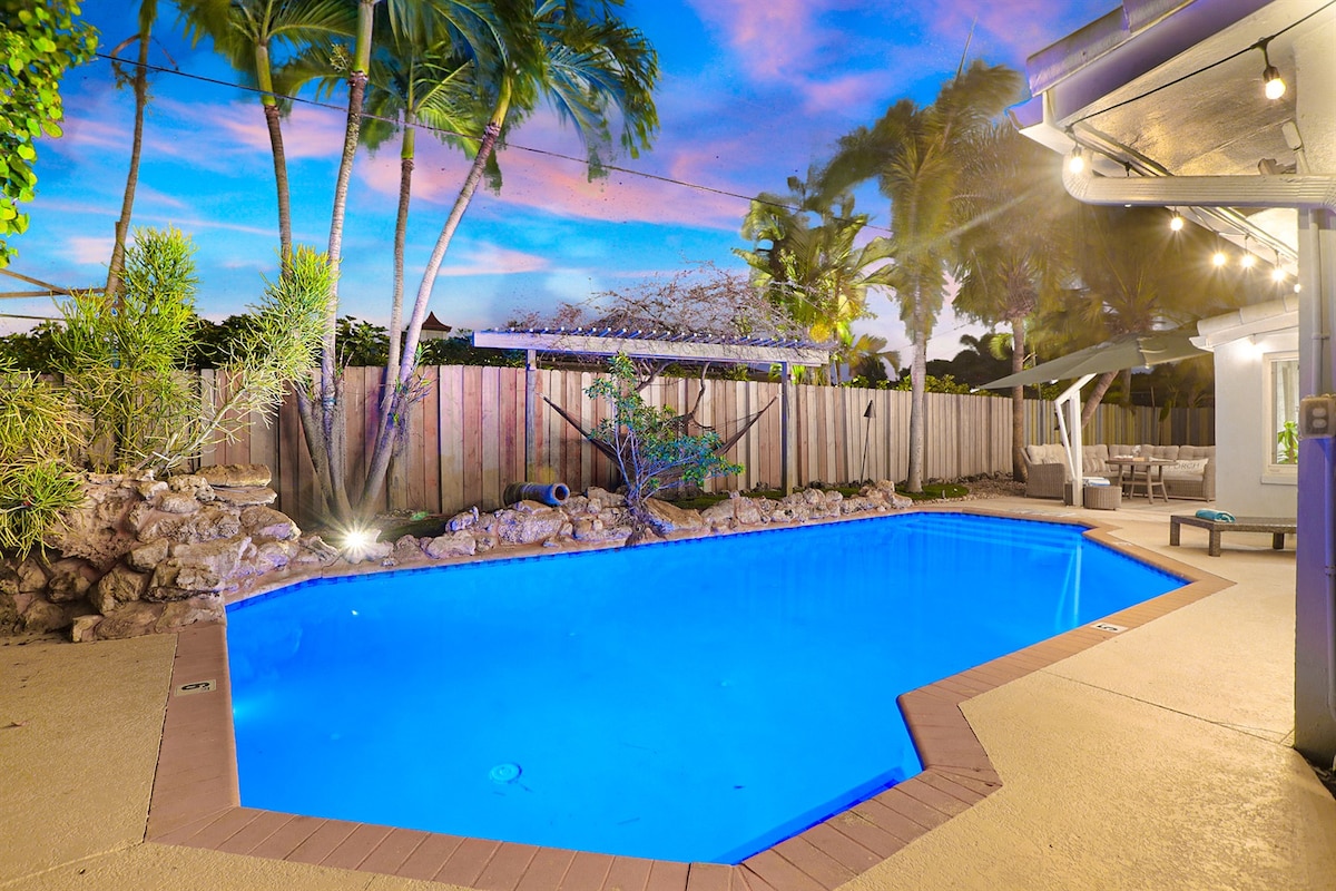Privat netværksopvarmet pool - Put Put Golf! Vores rummelige hus med fire soveværelser er perfekt til din familieferie. Vi er beliggende i et privat lukket område i Wilton Manors/Ft Lauderdale. Huset har en opvarmet pool, et golfområde, udendørs spisning og afslapning, smart-tv i hvert rum, 2 opholdsområder, et kontorområde og 2 store master suiter. You can walk to Mills Pond Park, which has tons of family activities & Mickel Park, with a splash pad workout area. Der er vilde kaniner! Pool eller spa