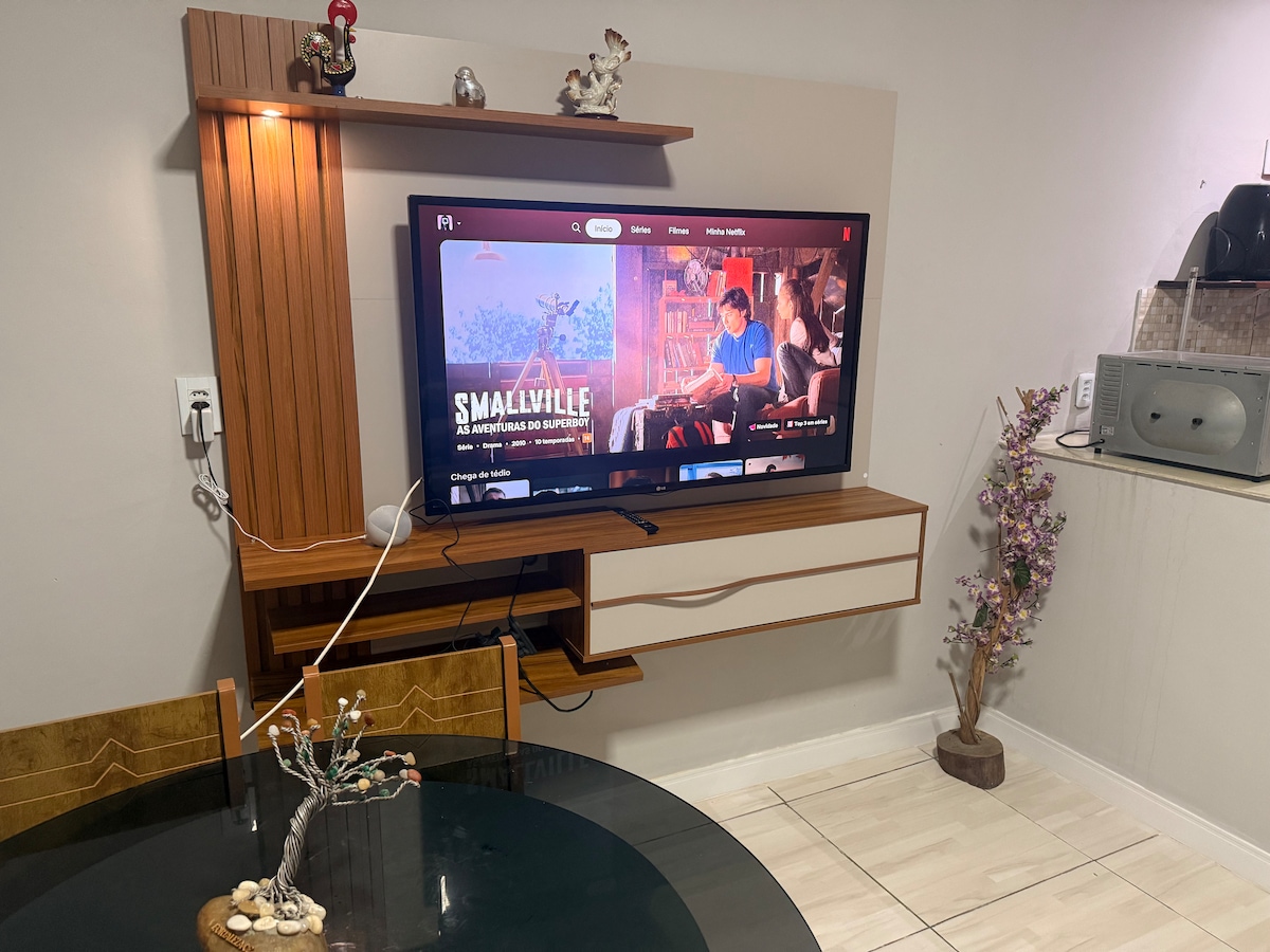 Esse apto é bem aconchegante e delicadamente decorado. Acomoda até 05 pessoas ( incluindo crianças). São 2 quartos e 2 banheiros, cama de casal, tv e ar condicionado nos 2 quartos. Cozinha completa com cafeteira, máquina de café DELTA, sanduicheira, liquidificador, microondas, airfryer, panelas, talheres, copos, pratos, etc. Varanda ampla, com uma cama de solteiro, rede, ventilador de chão, tela de proteção e cortina de vidro. Sala com TV e sofá retrátil.