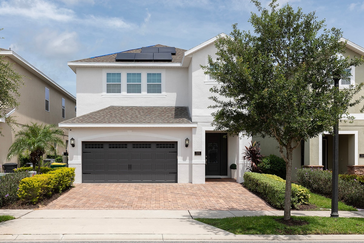 Slap af og nyd en fredfyldt ferie med familie og venner i vores smukke hjem kun 3 miles fra Disney World. Vores nyrenoverede spilrum er udstyret med 4 arkademaskiner, poolbord og airhockey. Nyd den private pool og et fuldt udstyret køkken. For nylig opgraderet smart home med smarte farve-LED-lys overalt. Vores netværk er tættest på Disney og andre forlystelsesparker. Vi ligger 6 minutter fra seværdigheder, spisning og shopping. Spa/sauna tilgængelig @ klubhus Poolen er lige blevet renoveret