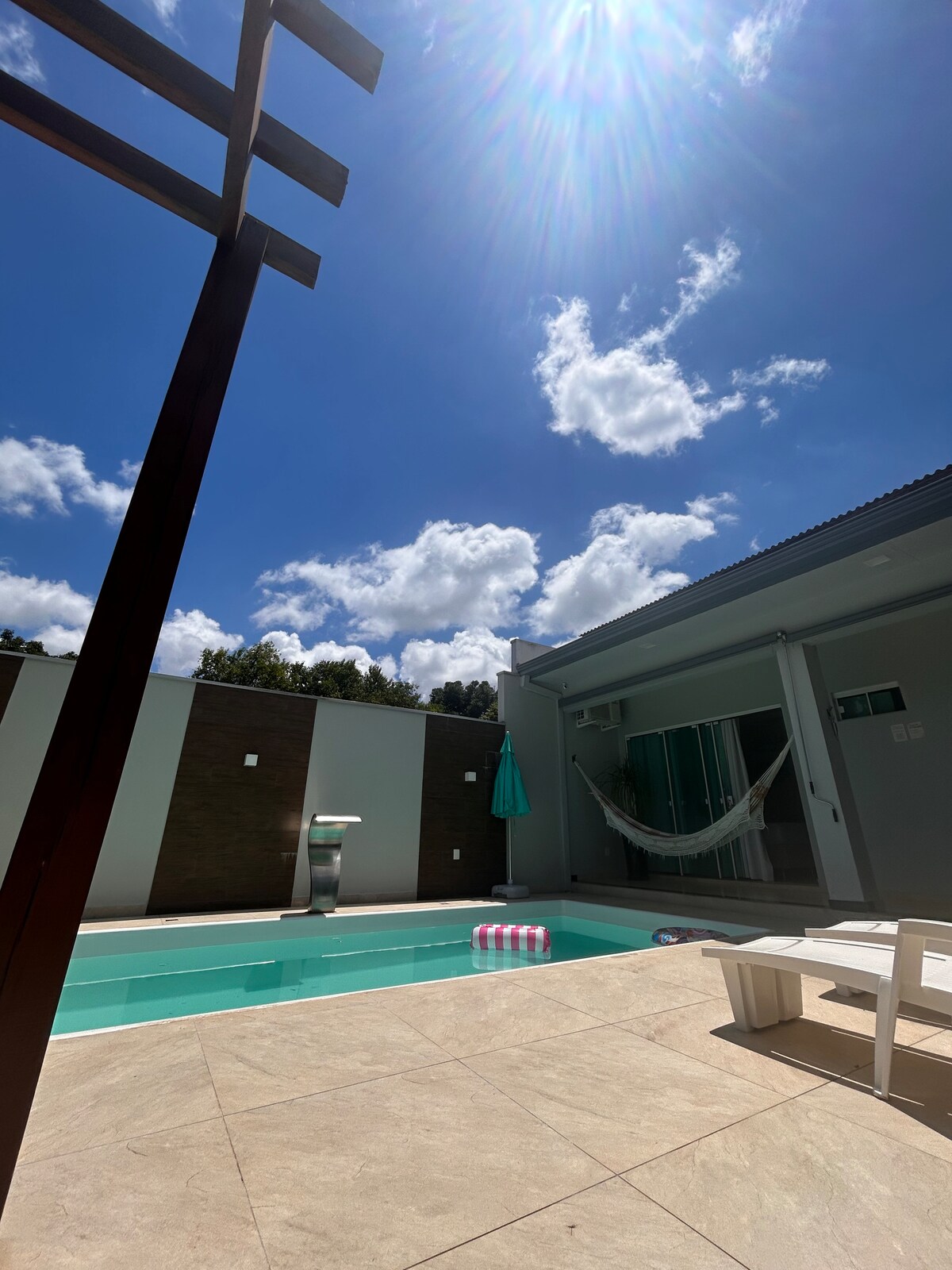HUS CIRKA 6 km FRA BYEN. INDTJEKNING EFTER KL. 14.00 – Gæsten skal vente op til 1 time, mens værten udfører ordentlig rengøring. EKSTRA: KÆLEDYR R$ 35,00. MERE END 2 GÆSTER: 100,00 BRL (per gæst) RYGNING kun udenfor og smid skodderne på et passende sted. Stille og roligt sted, fantastisk til at arbejde og studere og få en god nats søvn. Udendørsområde med elektronisk port, omgivende mure og overvågningskameraer.