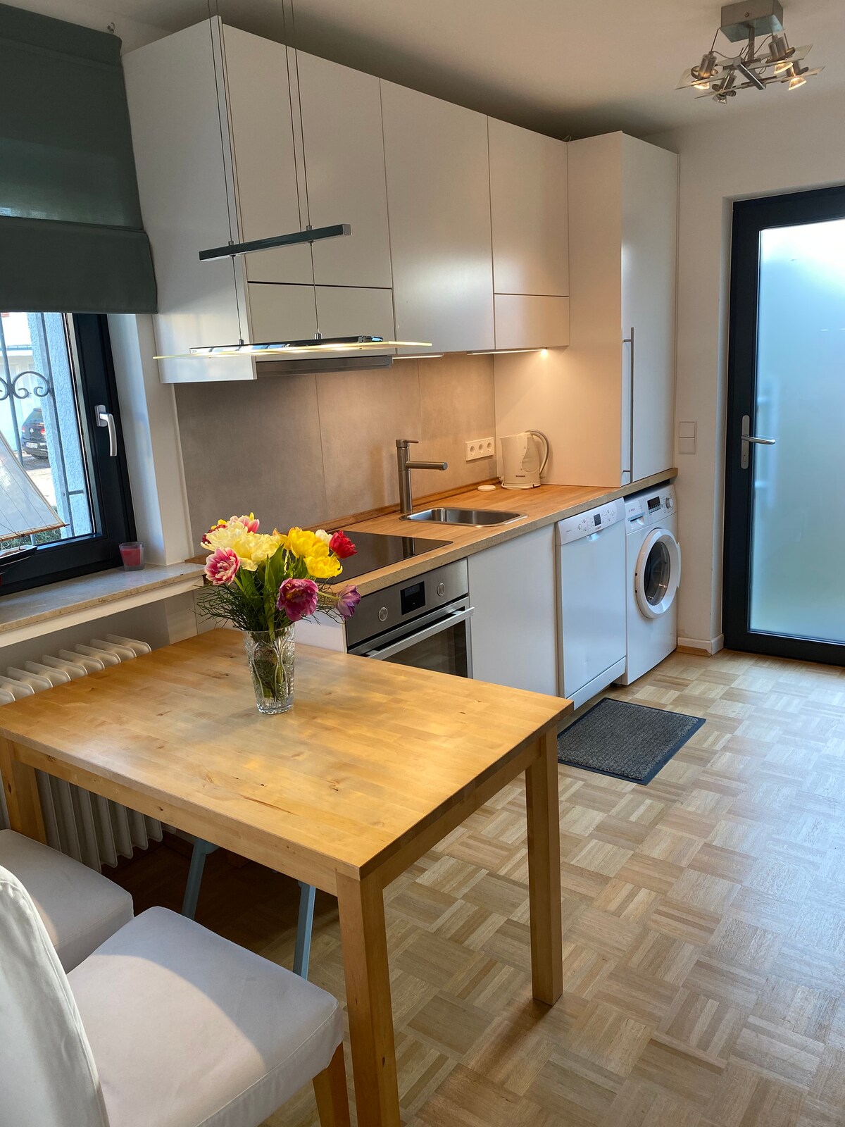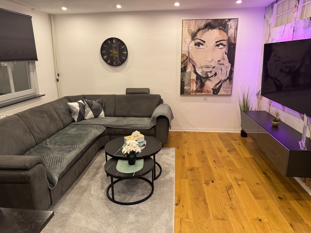 Rolig og stilfuldt indrettet 1,5-værelseslejlighed med central beliggenhed. Du kan forvente et moderne køkken med spiseplads, et nyt badeværelse med gulv til loft-brusebad og en lys stue/soveværelse med fladskærms-tv, kingsize-boxspring-seng og læsehjørne med internet/wifi. I umiddelbar nærhed er der et supermarked, bager, konditor, restauranter og meget mere. Privat parkeringsplads og direkte S-Bahn-forbindelse til FFM Messe/HBF inden for gåafstand.
