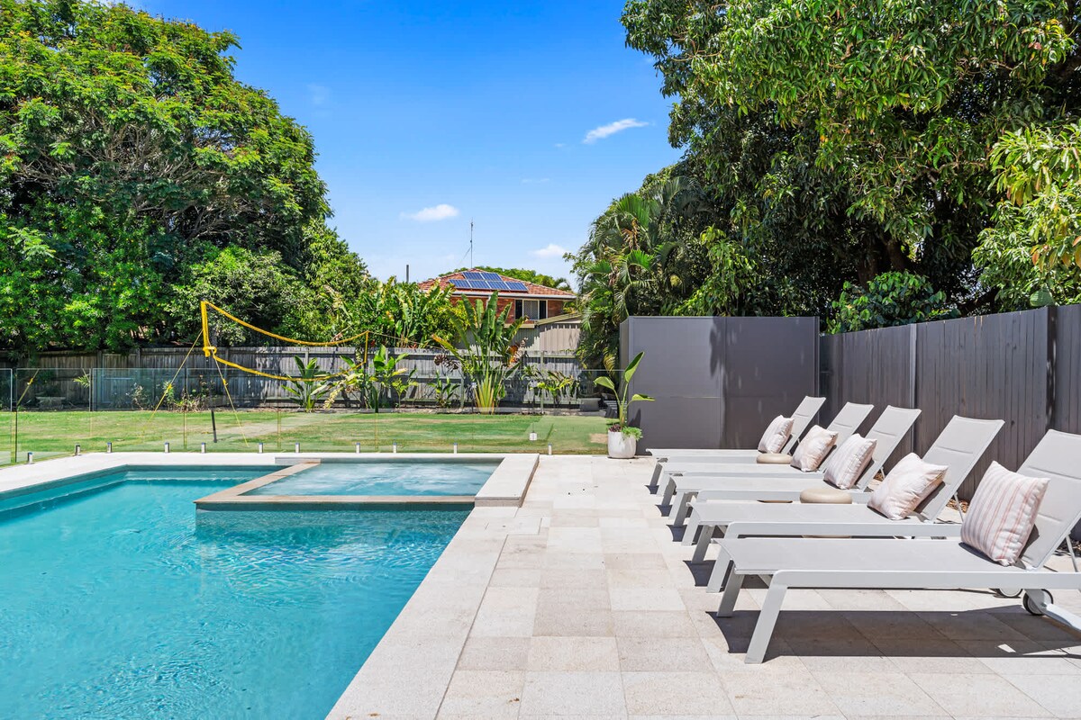 Fantastisk bolig ved stranden med 5 soveværelser bygget til familie og eventyr. Med to værelser med køjesenge, to værelser med queensize-senge (et med eget badeværelse og udendørs siddepladser) og et master-kingsize-retræte med stilfuldt åbent badeværelse og rolig udsigt over haven. Moderne indretning, klimaanlæg, wi-fi, smart-tv, stort opholdsområde, professionelt køkken, udendørsområde med grill, skinnende pool, trampolin, massiv have og kæledyrsvenlig. Direkte adgang til stranden gør dette til den perfekte familieferie.