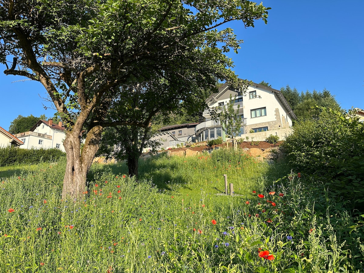 Meget lyst, nyt 2-værelses lejlighed med direkte adgang til den rummelige haveterrasse med WEBER gasgrill til gratis brug og enebrug. Udsigt over Flanitzbach til de glasklare haver i Frauenau. 5 minutter fra banegården. Køkken med følgende udstyr: Køleskab, komfur, kogeplade, opvaskemaskine, service osv. Svedisk brændeovn i soveværelset. Meget rolig og idyllisk beliggenhed. Honning fra egne bier og gratis skovvand. Eget nyt badeværelse med regnskovsbruser og toilet. Wi-Fi tilgængelig.