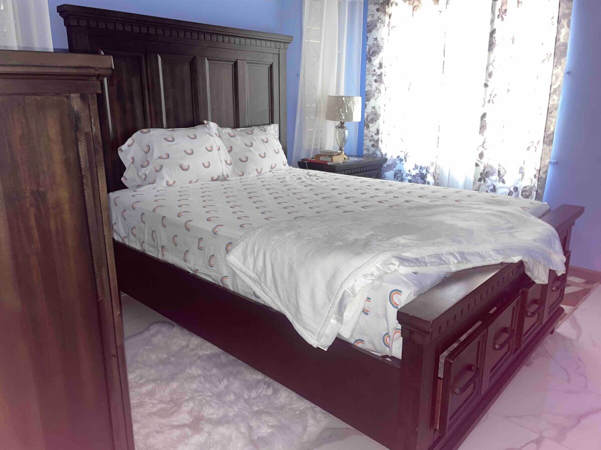 This beautiful 2 bedroom 1 bathroom home is located in the peaceful community of Aviary Old Harbour. Relax in comfort in Queen size bed in the main room with ac comfort. The second room is equipped with two twin beds. 24hrs camera that monitors the entrance. The location gives easy access to the Highway leading to Kingston, Ocho Rios and Montego Bay and also to Mandeville. Enjoy modern amenities with access to wifi and our outdoor verandah. Checkin with through the use of our key box system.