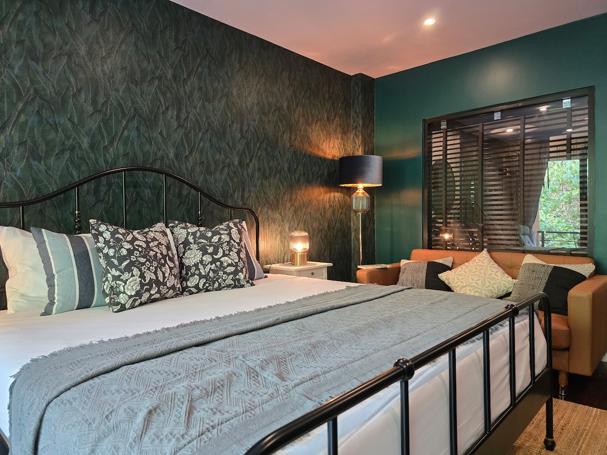 Vores lille miljøvenlige poolvilla ligger i en stille dal, lige ved Phuket Country Club, en af de smukkeste golfbaner i Phuket. Villaen, der blev bygget i 2021, har en velholdt saltvandspool, et stort overdækket udendørsområde med grill og separat sala, et separat soveværelse med tilstødende badeværelse og overdækket udendørs bruser, et lille køkken og en stor bambussofa, der inviterer dig til at slappe af... Villaen er ideel til singler eller par.