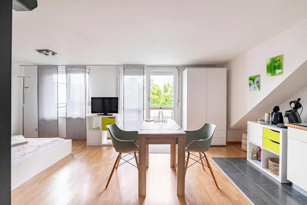 Havelejlighed i den eftertragtede bydel Herdern, en meget smuk bydel med gamle bygninger, villaer og alléer med gamle træer, 2 værelser, køkken, badeværelse, sauna, rolig og alligevel tæt på centrum af Freiburg, god infrastruktur. Charmerende pubber, caféer og restauranter (badrisk, spansk, italiensk og asiatisk køkken) inden for gåafstand. Tæt på Schloßberg, byhaven, den botaniske have og den gamle kirkegård.
