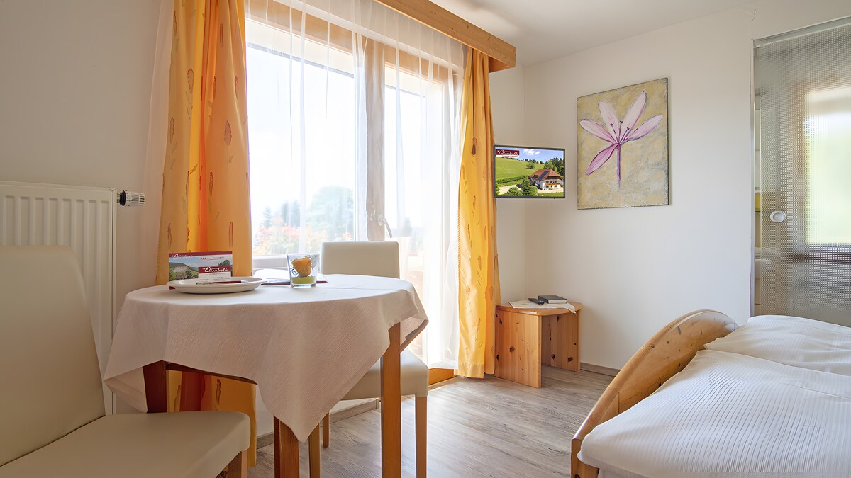 Room 3 with stepless interior is located in Reichenau and is perfect for an unforgettable vacation with your loved ones. The 25 m² accommodation consists of a bedroom and a bathroom and therefore offers space for 3 people. Facilities also include Wi-Fi, a TV and a fan. Please note that the room does not have its own kitchen. However, there is a separate, spacious communal kitchen next to the breakfast room.