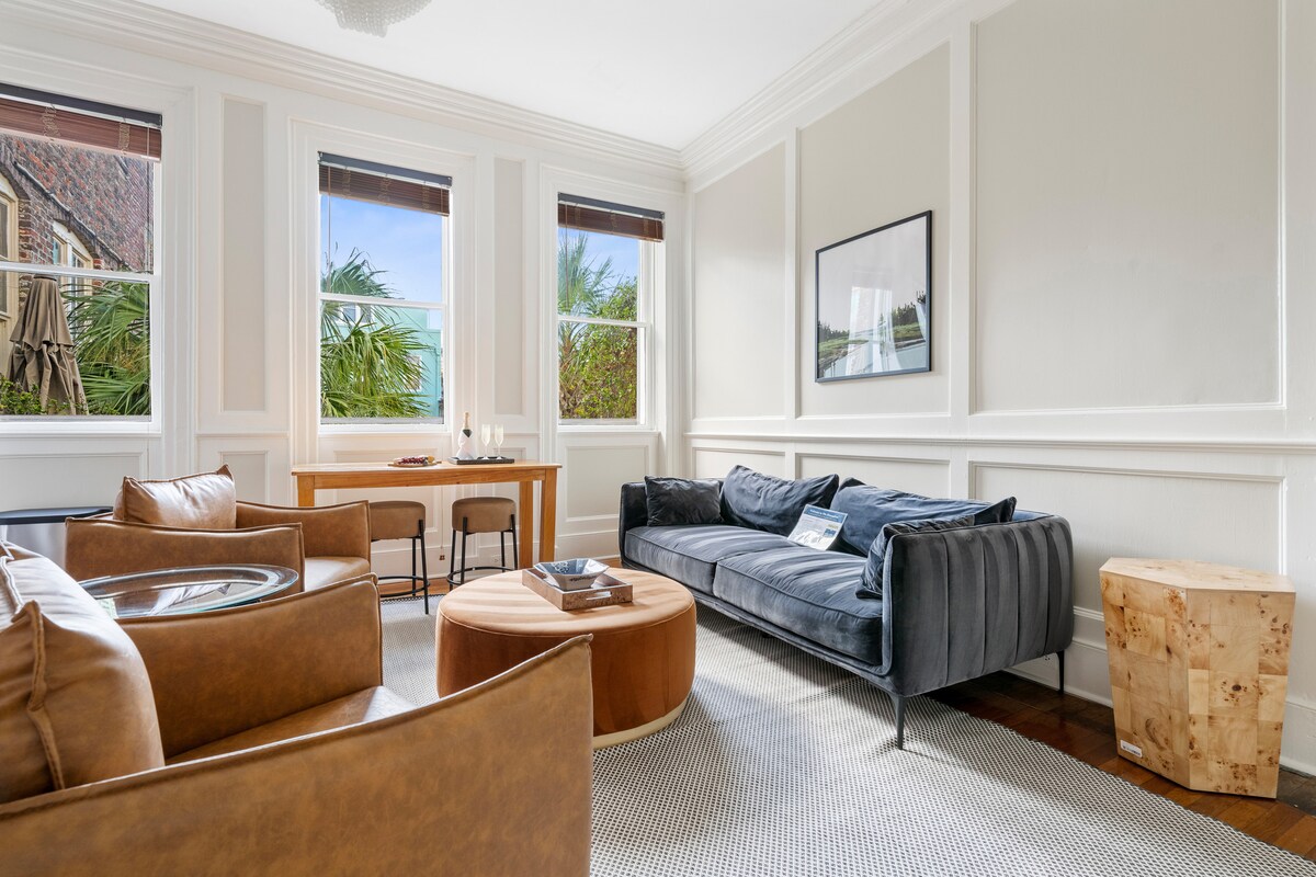 Skru tiden tilbage i denne raffinerede historiske bolig i Charleston (OP2025-06356). Svirvende 3,5 meter høje lofter, polerede trægulve og store vinduer sætter tonen for et elegant retreat. Et soveværelse og et solrum med gardiner har hver især kingsize-senge, så du kan sove fleksibelt. Beliggende i et roligt, historisk centrum, der kan nås til fods. Perfekt til par eller en sofistikeret weekend for piger. Privat indgang, gennemtænkt indretning på 1.000 kvadratfod. Eksklusiv parkering udenfor gaden med oplader til elbiler.