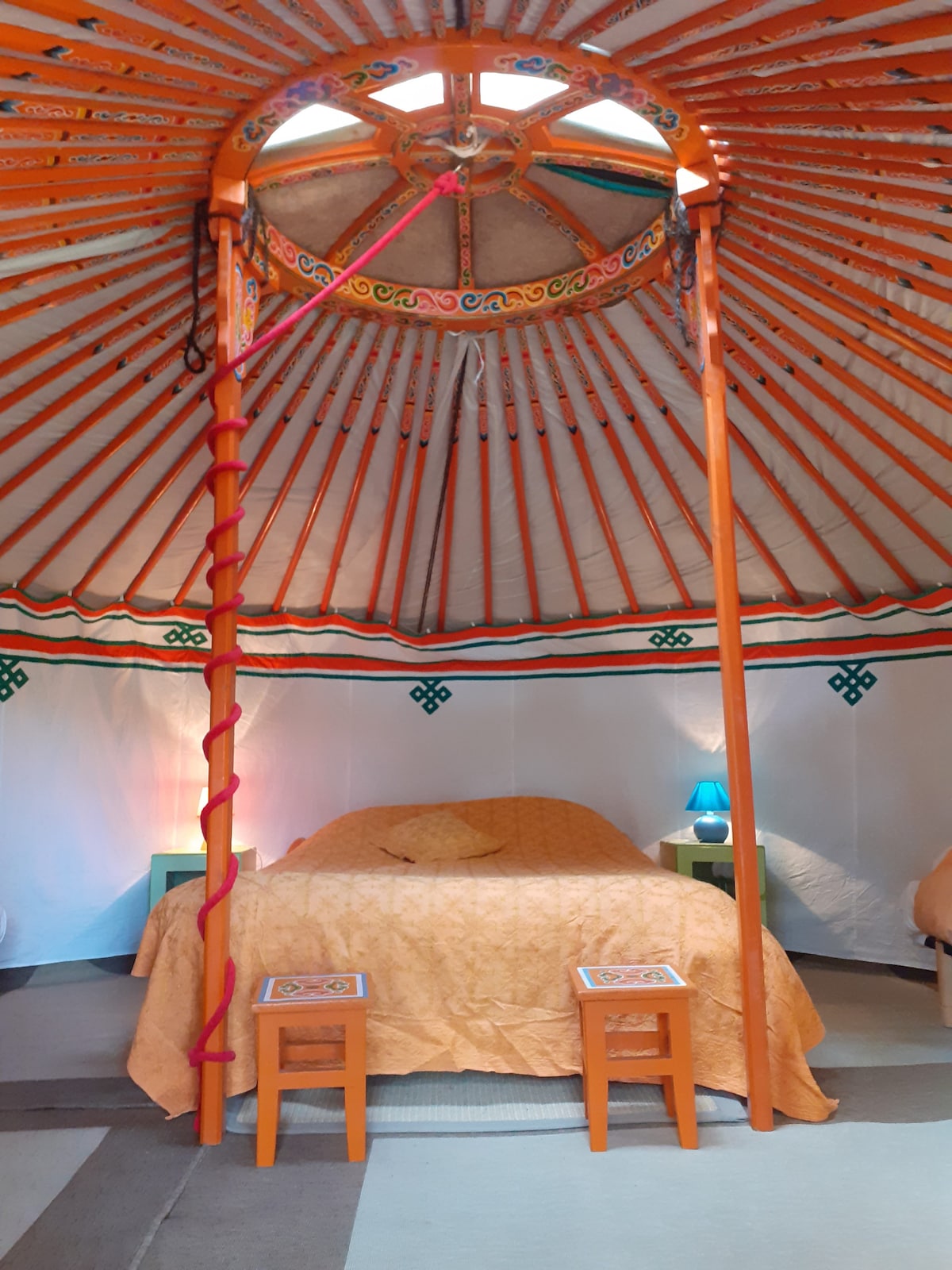 Stille og inden for Tous en Selle hesteejendom tilbyder vi en autentisk mongolsk jurte, der kan rumme 4 personer. Prisen omfatter morgenmad. Sanitære faciliteter er udelukkende forbeholdt beboerne i jurten. De består af et brusebad, toilet og en vask. Der er også et køleskab. På stedet og efter reservation har du mulighed for at spise eller tage en ridetur på pony. Et godt sted at genoplade batterierne!