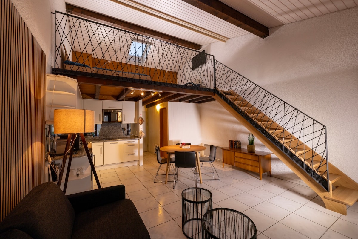 STUDIO på 25m2 og mezzanin på 10 m2 er placeret på forsiden af vores hus. Den består af et stort rum med køkken, spisebord, sovesofa til 2 personer. Brusebad, toilet. En hems med dobbeltseng. Denne lejlighed er udstyret med: hårtørrer, strygejern/strygebræt, køleskab, mikrobølgeovn, ovn, kedel, Nespresso kaffemaskine, brødrister og TV med Swisscom-Box og WiFi. Parkeringsplads. Mulighed for at opbevare cykler i et lukket rum.