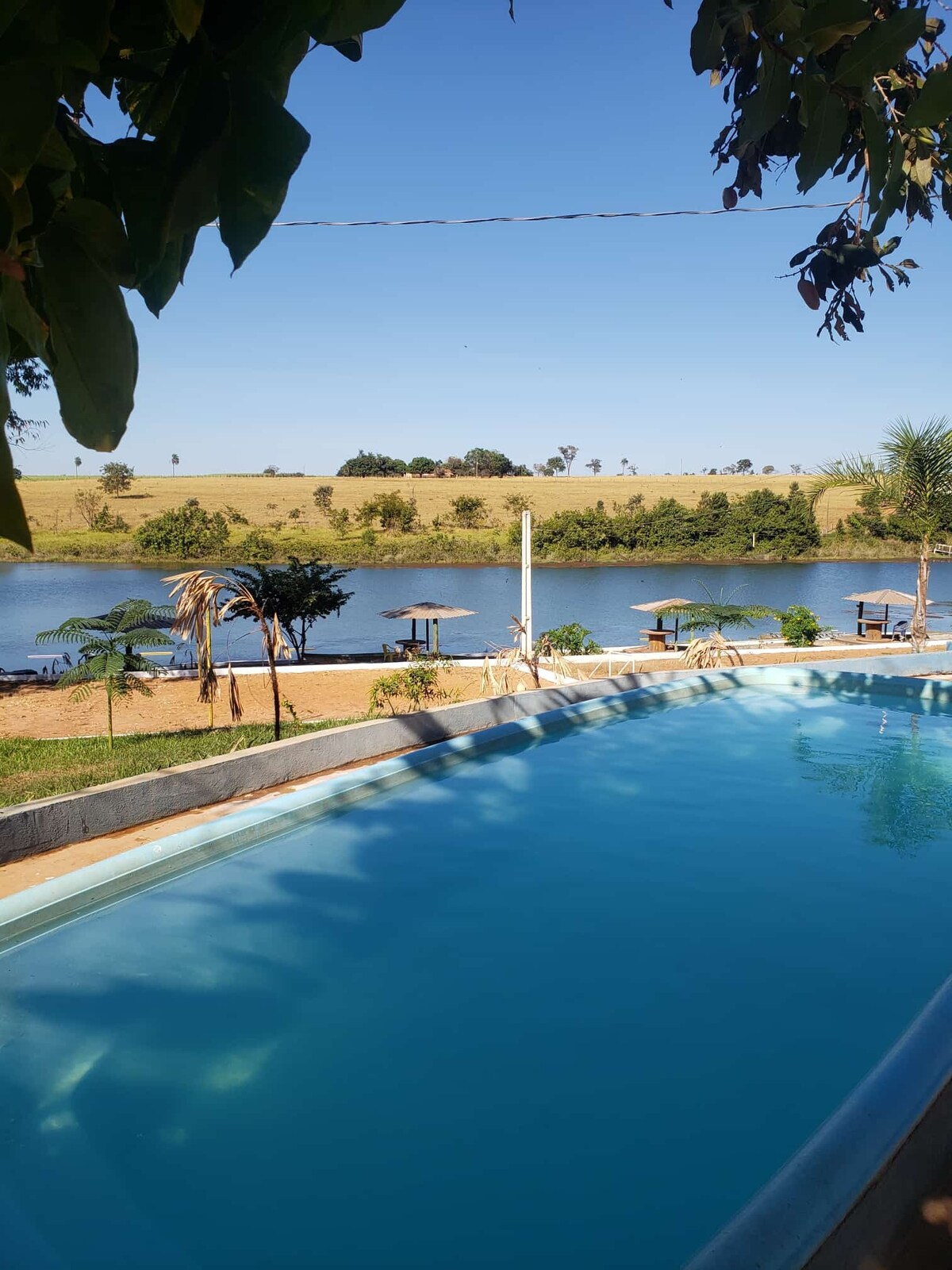 Ranch i Lago e Sol-kondominiet i Fronteira MG, 900 m fra Rio Grande-floden. Alle værelser har aircondition, ventilatorer og badeværelse. Udendørs køkken med grill, alt sammen integreret med pool. Solopvarmet swimmingpool. Ranch med alt køkkenudstyr, med kogeplade og elektrisk ovn. Køleskab og lodret fryser. Der er ikke sengetøj, håndklæder og puder.