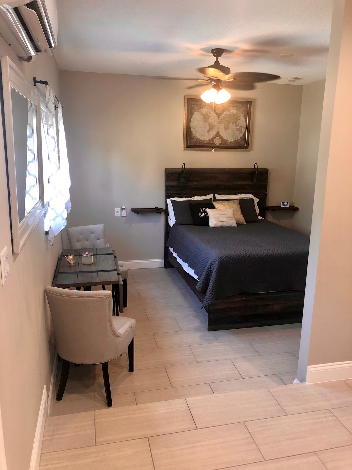 Our cozy urban-jungle retreat puts you in the heart of an impressive food district and is centrally located. You’ll be a short drive/walk from dozens of diverse restaurants and several concert venues. Our detached suite is great for both business travel (5 min from downtown) and pleasure (30 min from the theme parks). The main room of the suite has space for lounging, a wet bar, and a small desk. It connects to a room with a queen bed and ensuite bathroom.