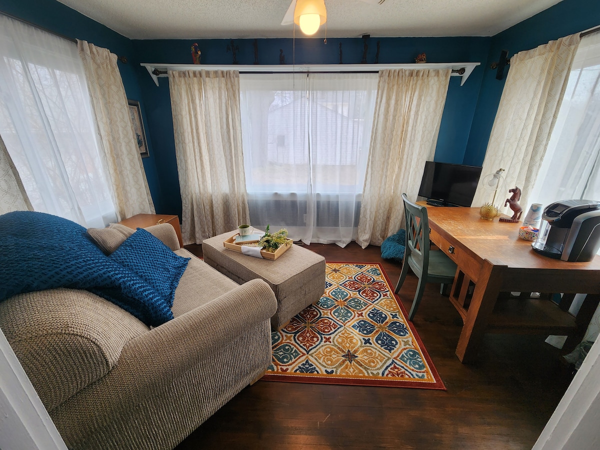 Vores sted er et hyggeligt gemmested på anden sal i en historisk bygning i centrum af Story City. Det er en sød lille by at slappe af i, der ligger en nem 15-minutters køretur fra Ames og alle dens faciliteter. Studielejligheden er lige blevet renoveret til et fristed med skandinavisk tema. Stuen har en udtrækkelig sofa, der kan rumme to, et smart-tv og et tekøkken. Soveværelset har en meget behagelig queensize seng, og 3/4-badet har alt, hvad du behøver for at komme væk i komfort. Der er gratis parkering lige udenfor.