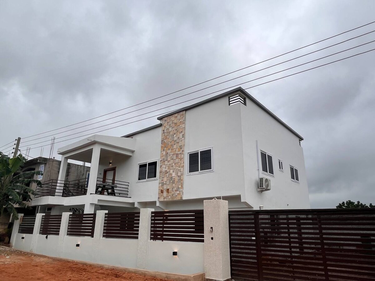 Luksusindkvartering beliggende på Accra Estate -Awoshie-vejen ved den nybyggede Pokuase-udveksling. Funktionerne omfatter: Fuldt møblerede værelser Velindrettede værelser med aircondition Åbent køkken Gratis morgenmad CCTV-kameraer, pålideligt Wi-Fi Elektrisk sikkerhedsfægtning Fremragende vej 25 minutter til lufthavnen, 25 minutter til turisternes steder på Akuapem Ridge 20 minutter til Accra West strande 20 minutter til UGMC Ultra-modern Teaching Hospital Sikkerhed 24/7, selvkørende køretøj til rådighed efter anmodning