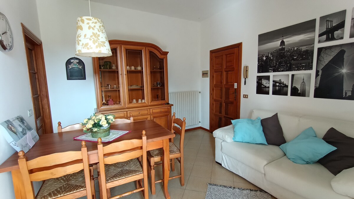 Appartamento accogliente con ingresso indipendente, ubicato al piano terra di una villa bifamiliare con giardino. A soli 500 metri dal centro del paese in zona poco trafficata (le uniche auto di passaggio sono quelle dei residenti), offre la possibilità di soggiornare in zona tranquilla, immersa nel verde ma a due passi da tutti i servizi. Scuole, negozi, medico di guardia, farmacia ecc. sono facilmente raggiungibili a piedi.