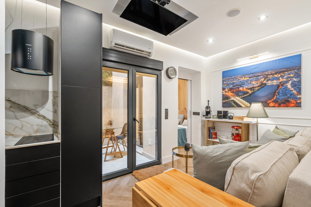 Moderne og lille studie på 24 m2 beliggende i en klassisk bygning i Madrid med en gårdhave i hjertet af Chamberi-kvarteret, gastrohjertet par excellence. Åbent rum med højt til loftet, hvor du vil føle dig som på et feriested, kun 30 meter fra Calle Ponzano, der er berømt for sit gastronomiske tilbud. Wi-fi og tv med streamingplatforme. To metrolinjer, 1 og 7, og flere busser. Det er meget godt forbundet med hele Madrid. Du kan også gå en 20 minutters tur til Madrid centrum.