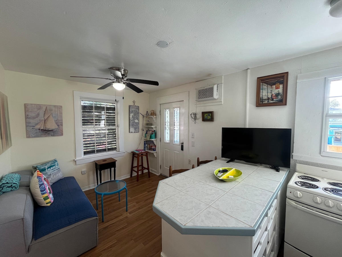 Denne centralt beliggende studiolejlighed ligger kun få minutters kørsel fra alle Galvestons største attraktioner. Lejligheden er blevet opdateret med nye gulve, maling, møbler, koldt klimaanlæg osv. Det ligger bag hovedhuset i en separat bygning med egen indgang og en parkeringsplads til gæster. Gæster har adgang til hovedboligens baghave. Ingen højlydt opførsel af hensyn til naboer. Flere dagligvarebutikker inden for gåafstand. 0,6 miles til stranden.