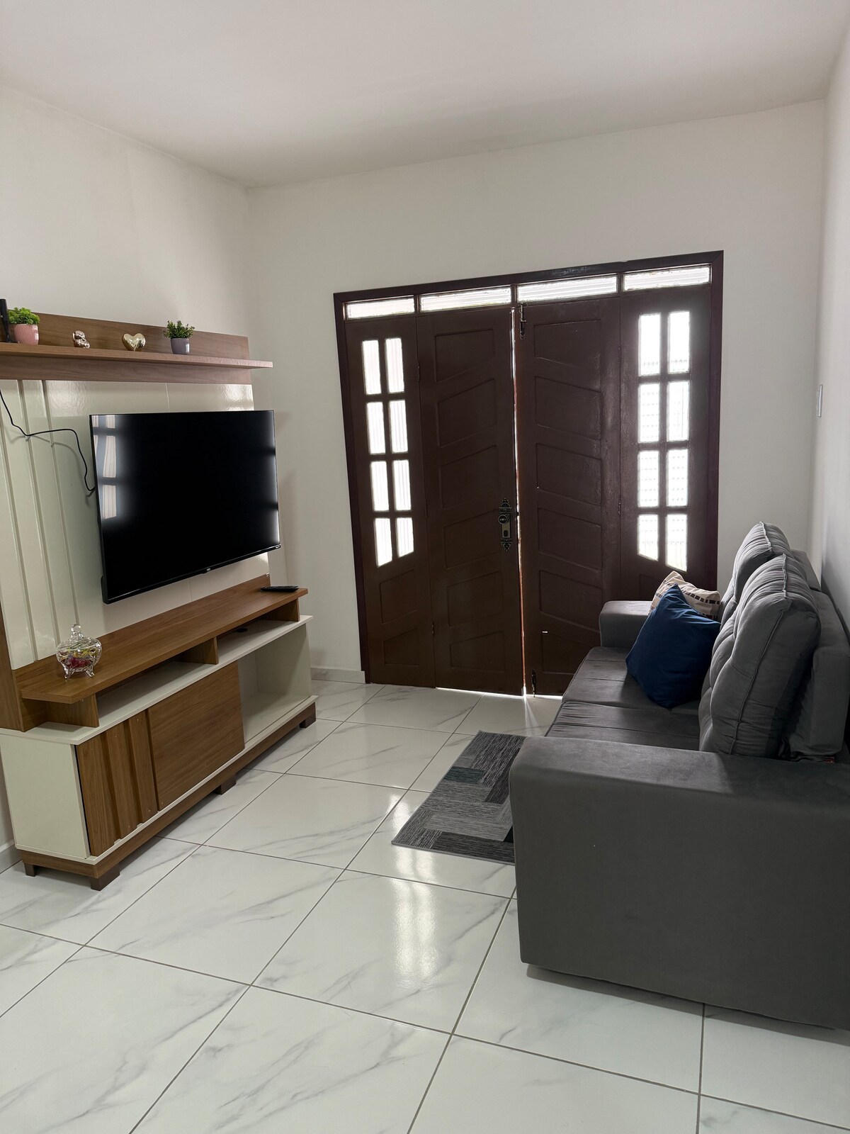 Casa completa com três quartos, o quarto de casal tem suite e os outros dois são de solteiros com uma cama cada, banheiro social. sala, cozinha e área de serviço e garagem. NÃO DISPOMOS DE TOALHAS DE BANHO.