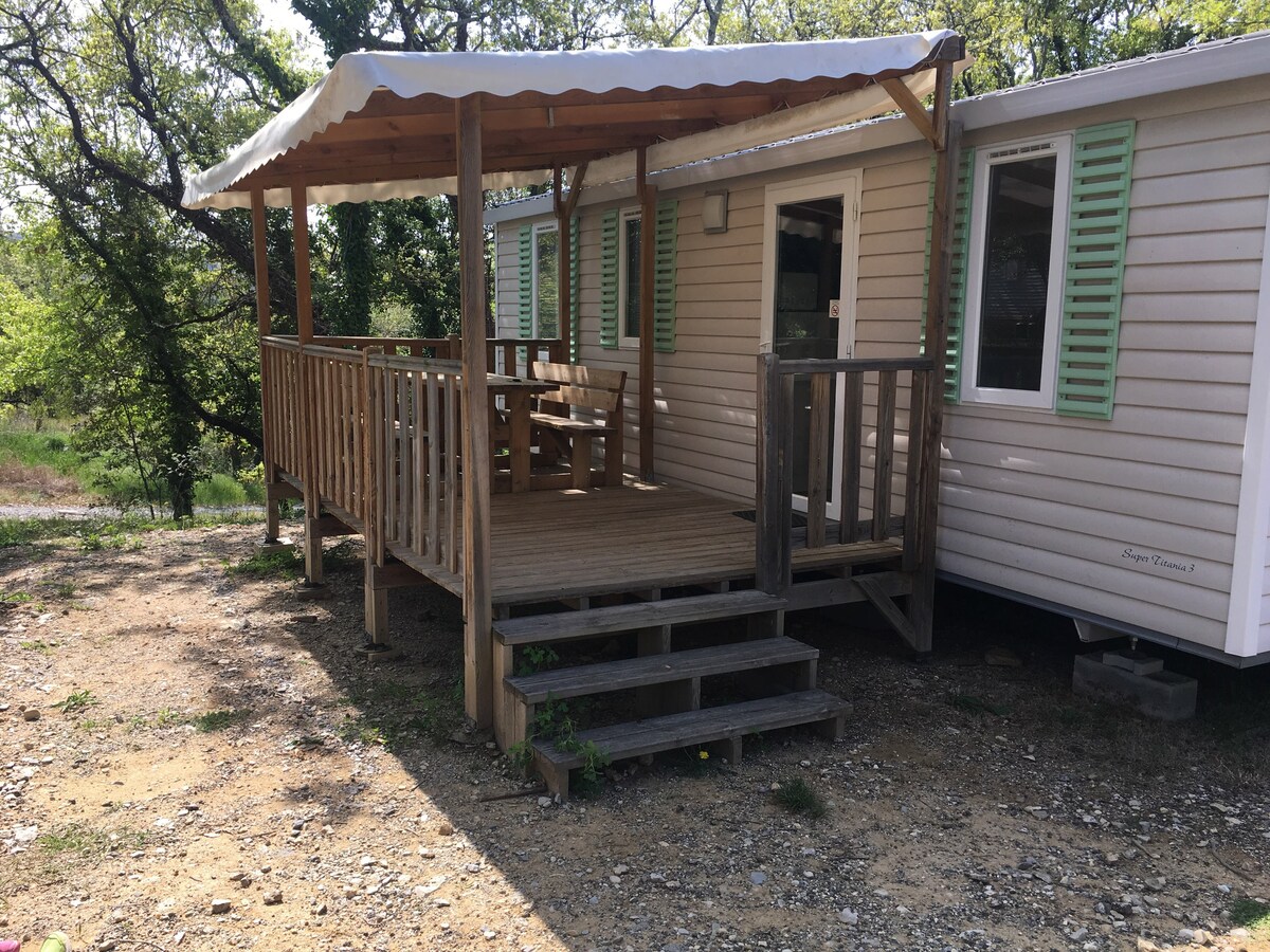 Airconditioneret mobilhome med overdækket og udstyret terrasse. 2 chbres, 1 med 1 dobbeltseng, 1 med 3 enkeltsenge, herunder 1 hængende til børn op til 6/7 år. 1 konvertibel plads 2 pers. fra stuen. lagner til rådighed! badeværelse. Separat toilet. mikrobølgeovn, kaffemaskine, kedel, køleskab, fryser. grill elec . Tv. Dog ( sf cat 1, 2 or may be behavioral problem) cat accepted within the limit of one pet per stay. Værelser forbudt for kæledyr eller tæpper!