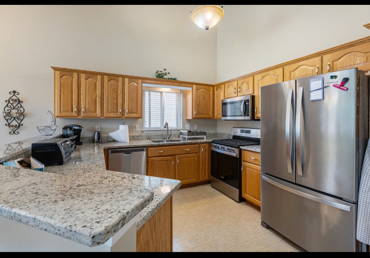 Dette er en privat gæstesuite (FULD lavere niveau walkout - ca. 1.758 kvm) i vores større 3-etagers beboede hjem. Et behageligt hjem med 2 soveværelser, 1 fuldt badeværelse, stue og køkken med fuld køleskab, opvaskemaskine, kaffemaskine, elektrisk komfur, brødrister, mikrobølgeovn og bordplade med plads til 6 personer. Nye madrasser, sengetøj, puder og håndklæder. Gæster er velkomne til at bruge terrassen bagved med naturlig bålplads, overdækket pavillon med gasildfunktion, grill og spabad. Fantastisk wi-fi og smart-tv.