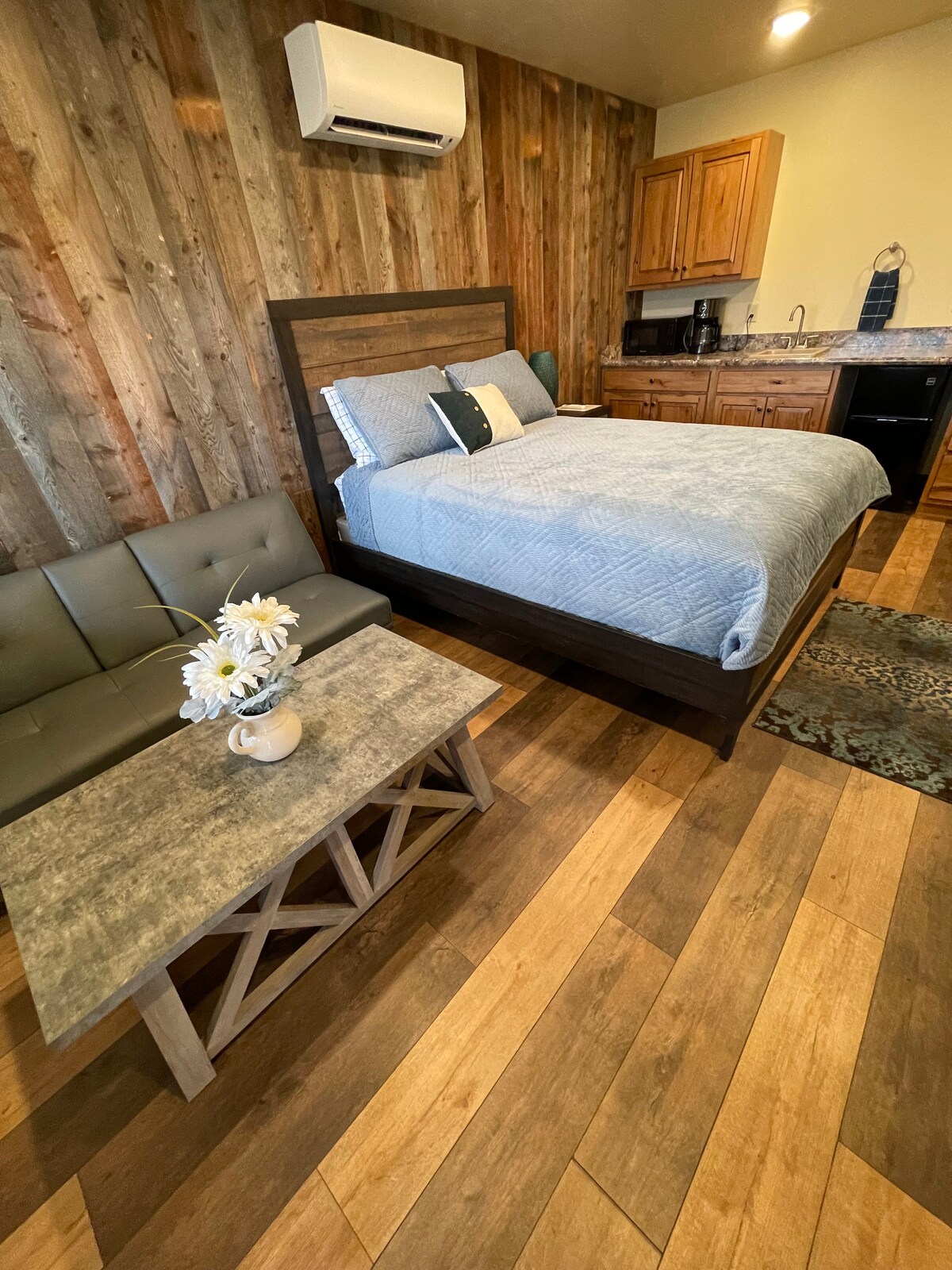 This rustically beautiful two-bedroom King Suite has all the comforts of home. With a fully equipped kitchen, a large luxurious bathroom, and a spacious, yet cozy floor plan. Enjoy the richness of a king bed in one bedroom and a queen bed with a queen-size sofa bed in the other. This unit is sure to have everything needed to make your stay perfect! This is a pet free home. You will be charged a $1000 fine if you bring a pet into this home.