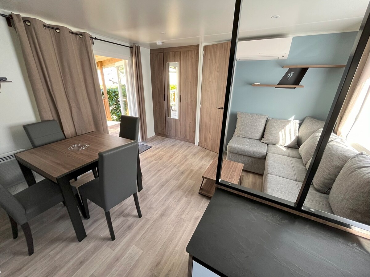 Charmerende Bora-Bora mobilhome (6/8 personer) 3 soveværelser (1 master suite/omklædningsrum, 2 soveværelser (2 enkeltsenge + opbevaring) + 1 stor konvertibel sofa. Smuk overdækket terrasse, gasgrill til dine måltider. Alle hjemmets bekvemmeligheder (opvaskemaskine, vaskemaskine, satellit-tv osv.) til en fantastisk ferie. Adgang til Lake Biscarrosse-stranden og cykelsti. Der tilbydes mange aktiviteter på campingpladsen 🏸🏓⛳️🏋️🏊🏻♂️🚴♀️ ⚠️ Fun Passes er påkrævet for visse aktiviteter.