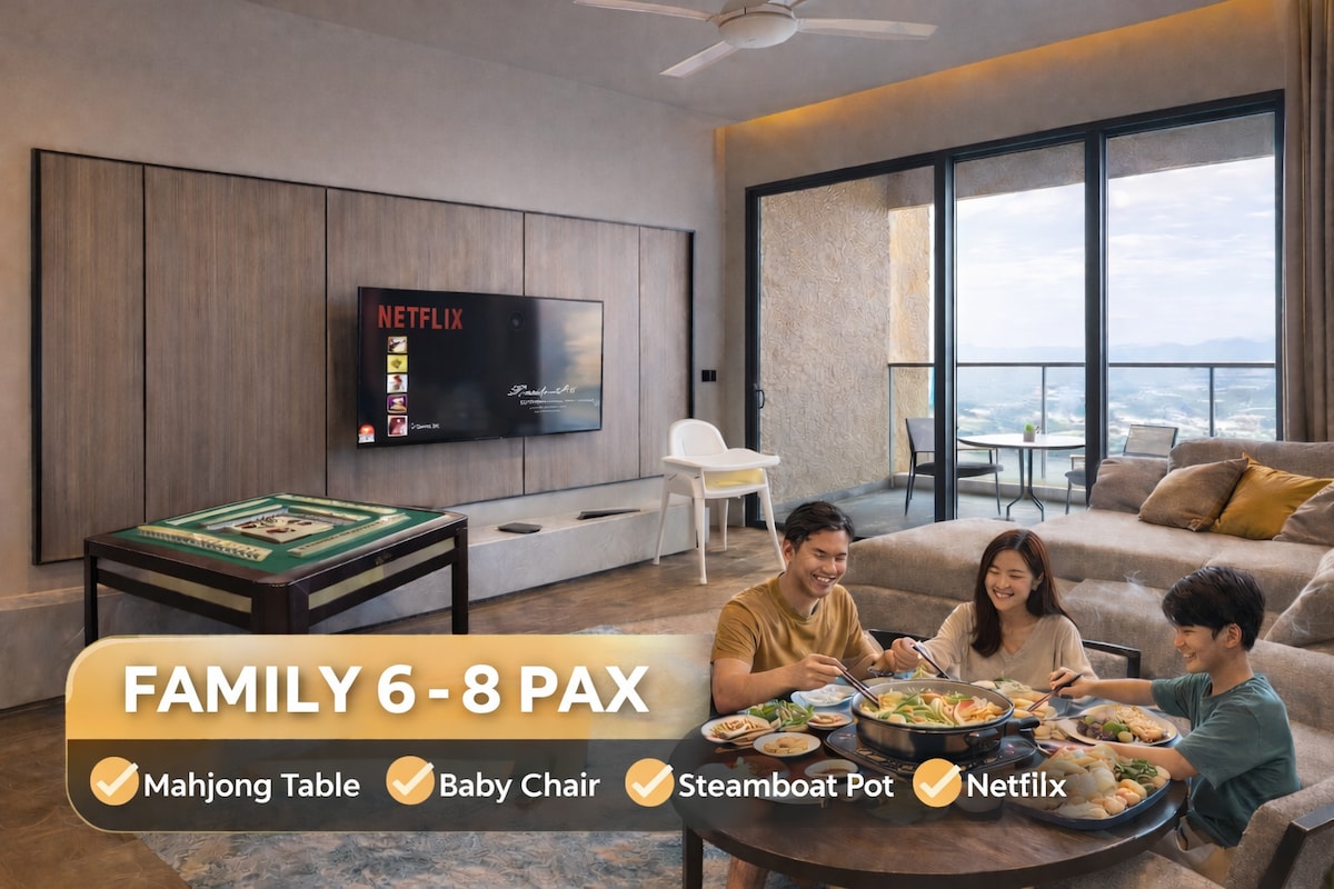🏡 Rummelig 3R2B-familiesuite • 🛁 Jacuzzi • 🎲 Romme/Mahjong • 🍲Steamboat Nyd en moderne familiesuite med 3 soveværelser med Netflix, mahjong-/rommebord, dampbådsæt og en privat jacuzzi på balkonen. Vågn op til en fantastisk udsigt over bjergene med en direkte bro til SkyAvenue. Denne helt nye bolig passer til 6–8 gæster med 2 ekstra madrasser. Over 50 familievenlige faciliteter på stedet. Kun 15 minutter via rulletrapper til SkyAvenue og First World Plaza. Parkering: 10 RM hverdag/15 RM weekend. (Per indgang)