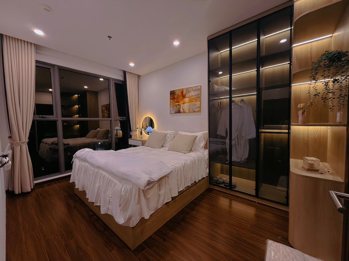Oplev 5-stjernet luksus i denne stilfulde gråtonede lejlighed med et badeværelse med glasvægge, rå sten og førsteklasses finish. Perfekt beliggende i hjertet af Ecopark, kun 3 minutter til Swan Lake og 30 minutter til Hanoi Old Quarter, med restauranter, caféer og butikker lige ved din dør. Udstyret med Dyson-blæser, Bluetooth-højttaler og moderne faciliteter samt adgang til fitnessrummet og swimmingpoolen på 3. sal — perfekt til et ophold i højderne.