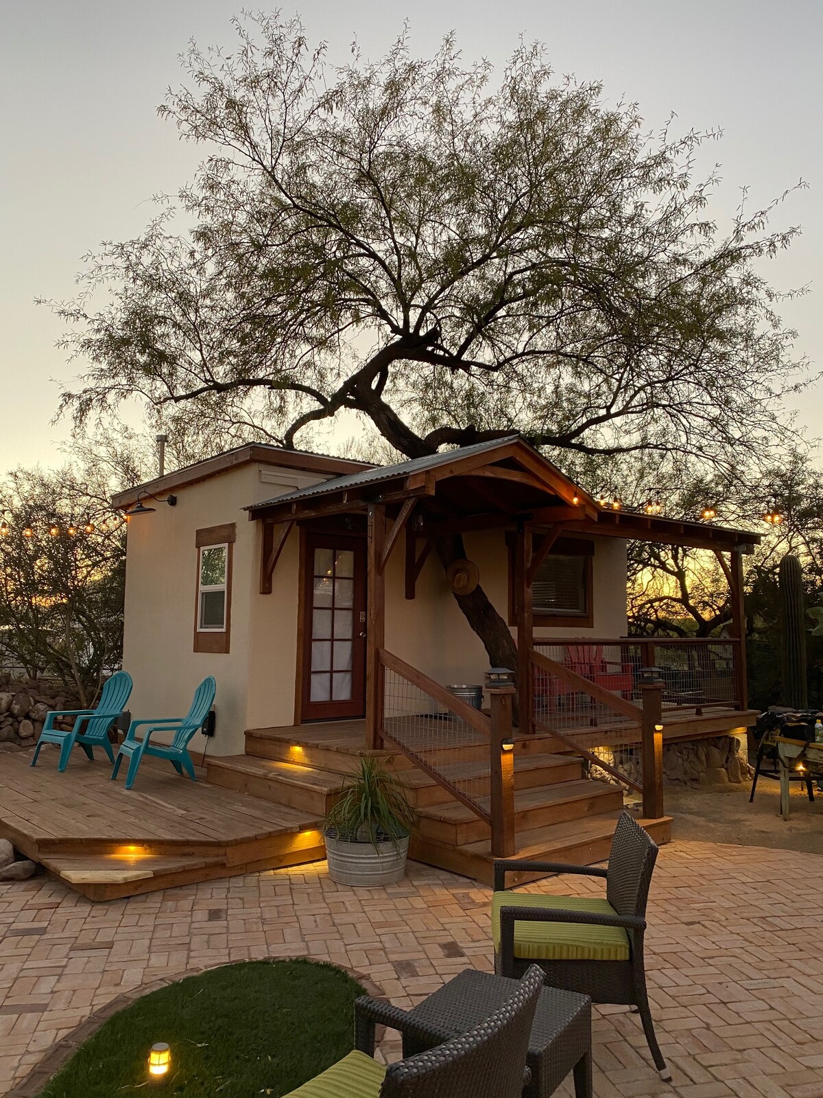 The Tree House / Tiny House is our 200 sq ft guest house, nestled in our private primary residence back yard. This little house has everything you'll need for a short stay. The DOUBLE bed turns into couch. Small Fridge, burner, microwave, coffee maker & other essentials. private toilet and shower (no bathtub). Walking distance to L.O.S.T. Trail which connects to the Arizona Trail, walking distance to bridge that leads to main street and access to wifi, grill, hot tub and private parking.