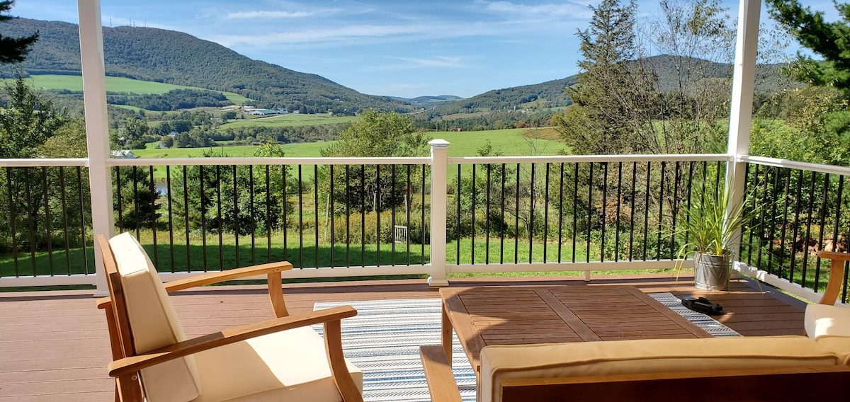 En stor udflugt venter dig på 12 hektar privat jord. Hvis du foretrækker en afslappende ferie, eller hvis du ønsker at deltage i lokale aktiviteter (vandreture, cykling, svømning, skiløb, snesko, slæde), er dette dit sted. Nyd 360 graders udsigt over Catskill Mountains fra næsten hvor som helst på ejendommen. Nip til din morgenkaffe, mens du ser solopgangen på den store terrasse. Leg i den store private gårdhave. Klare aftener er de bedste til solnedgange, bålplads og stjernekiggeri.