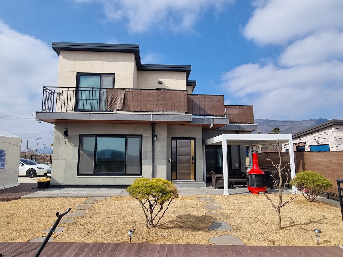 Et sted, hvor du kan slappe af med naturen og vennerne omkring dig Der er en stor græsplæne Jangdokdae Afsidesliggende landhuse langt væk Tæt fyrreskov på bjerget bagved ~ Et sted, hvor azaleaer, krisantemum og cosmos blomstrer mellem klipperne fra foråret ~ Det er et sted, hvor du kan vågne op til en frisk morgen med lyden af fugle. Du kan nyde en grill i haven, og drikke te i en hvid vindhytte med en fotozone, og have en hyggelig snak. 400 meter nedenfor er den populære 2nd Warehouse Cafe og den store og smarte Duunni Cafe (1 minut i bil), som begge er meget populære. 3 minutter væk er det berømte Oktokki Space Center, hvor du kan tage på en helbredende rejse med dine børn. Der er også et lille charmerende rum på 2. sal, hvor du kan drikke te med udsigt over bjergene~